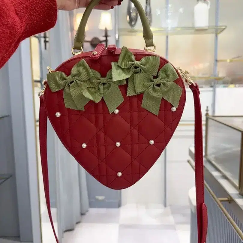 고급스러움이 가득한 퀼팅에 펄과 리본을 더한, 달콤하고 사랑스러운 딸기 디자인의 숄더백.