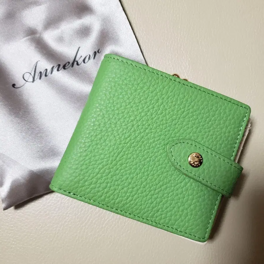 선명한 그린 색상의 가죽(소가죽) 접이식 지갑, 카드 포켓이 있어 실용적입니다.