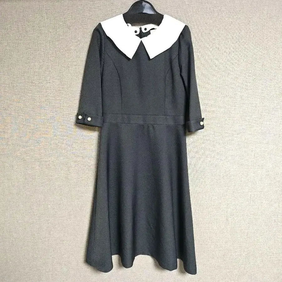레스 빠세 플레어 칼라 원피스 반팔, 5부 소매 색상: 블랙 사이즈: 38 소매에 펄이 달려 있습니다. 옷깃은 버튼으로 탈부착 가능합니다. 보풀은 없지만, 3~4회 착용한 구제 의류이므로 양해 부탁드립니다. 작게 접어서 발송 예정입니다.