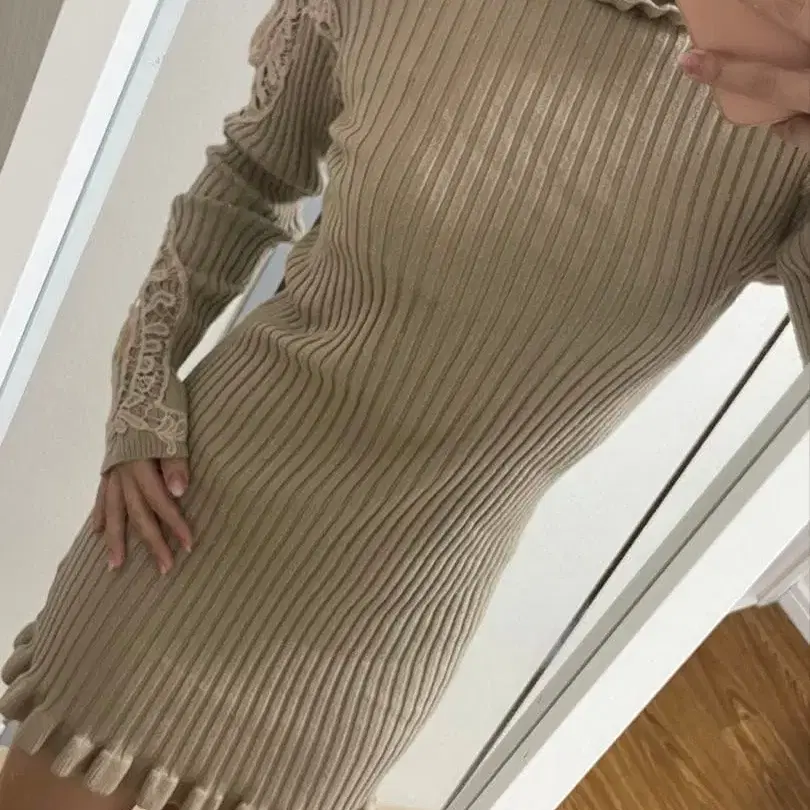 베이지 니트 원피스 레이스 긴팔