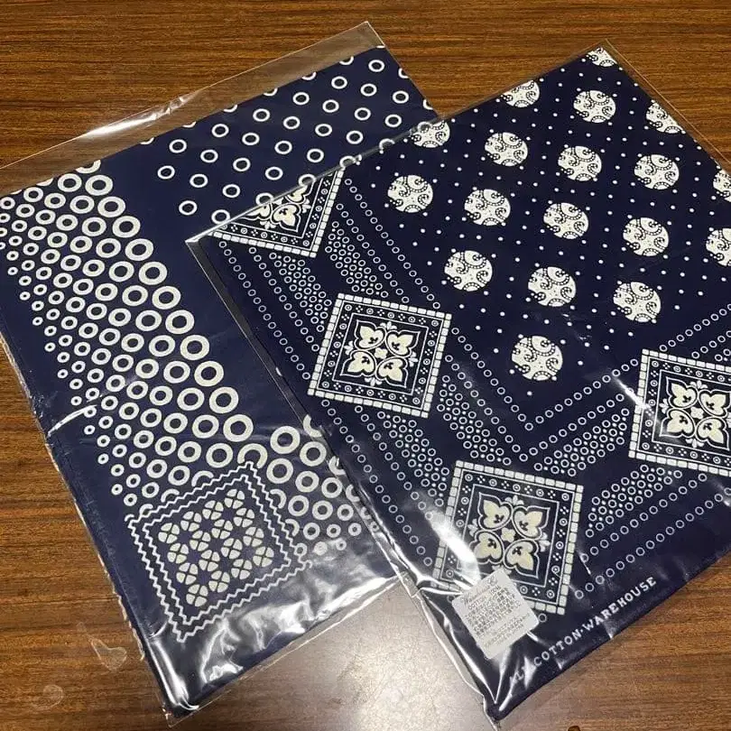 빈티지 시장에서도 인기가 높은 도트 무늬 양쪽 귀가 있는 반다나. 희귀한 전용 직기로 짜이기 때문에 원단 양쪽 끝에 귀(셀비치)가 보입니다. 한 변에 귀가 있는 반다나이지만, 더 오래된 시대에는 이처럼 양쪽에 셀비치가 오는 것이 존재합니다. 이는 셔틀 직기라고 불리는 구식 동력 직기의 기술이 아직 미숙했던 시대, 가로실을 먼 거리를 날려 보내면서 짜임 흠집 등의 트러블이 발생할 리스크가 높았기 때문입니다. 폭이 좁은 만큼, 가로로 두 장을 사용하는 것이 아니라 한 장을 그대로 사용하여 양쪽 모두 셀비치가 오도록 했습니다. 원단은 인디고이기 때문에, 눈에 띄는 페이드가 보이는 것도 특징입니다.