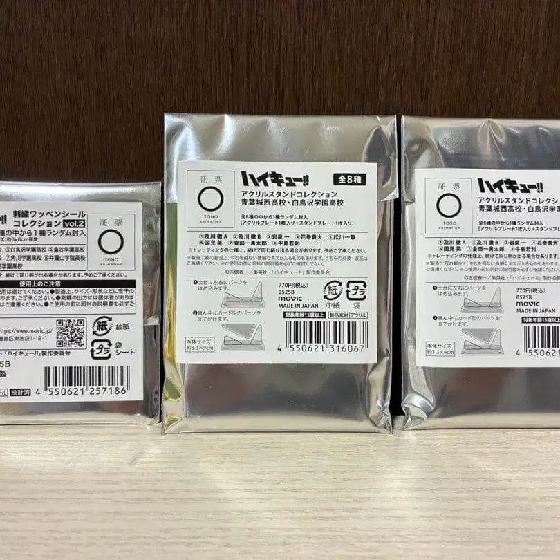 하이큐 MOVIC 무빅 ◯ 아크릴 스탠드 컬렉션 아오바죠사이 고교 시라토리자와 학원 고교 정가 세금 포함 770엔 2개 ◯ 자수 패치 씰 컬렉션 vol.2 정가 세금 포함 880엔 1개 둘 다 미개봉품입니다.