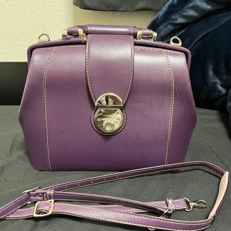 퍼플 색상의 가죽 핸드백, 탈부착 가능한 스트랩 포함, 둥근 디자인.