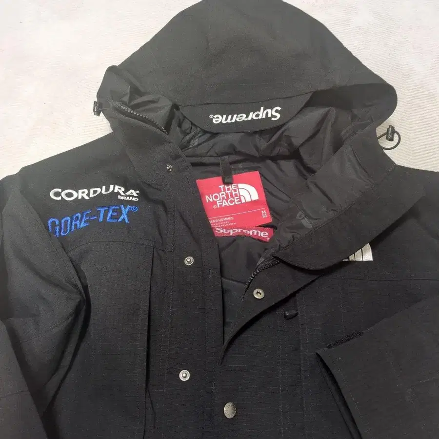 GORE-TEX와 CORDURA 소재를 사용한 블랙 후드 부착 자켓.