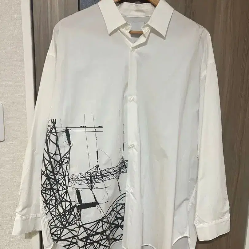 아트 프린트가 들어간 화이트 롱 긴팔 셔츠.