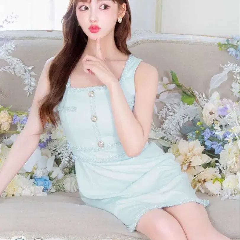 자동 번역되었어요. 원문보기민트 그린 색상의 버튼이 달린 드레스, 장식적인 레이스와 비즈