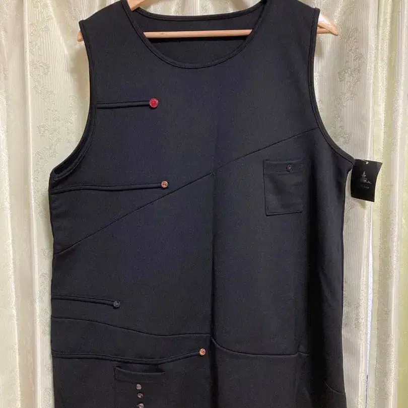 포켓이 달린 블랙 베스트, 예술적인 디자인이 특징입니다. - 브랜드: Artemis - 사이즈: LL - 소재: 폴리에스테르 95%, 폴리우레탄 5% - 색상: 블랙 - 디자인: 포켓 부착, 버튼 장식 방문해 주셔서 감사합니다. 사이즈 - XL(LL)