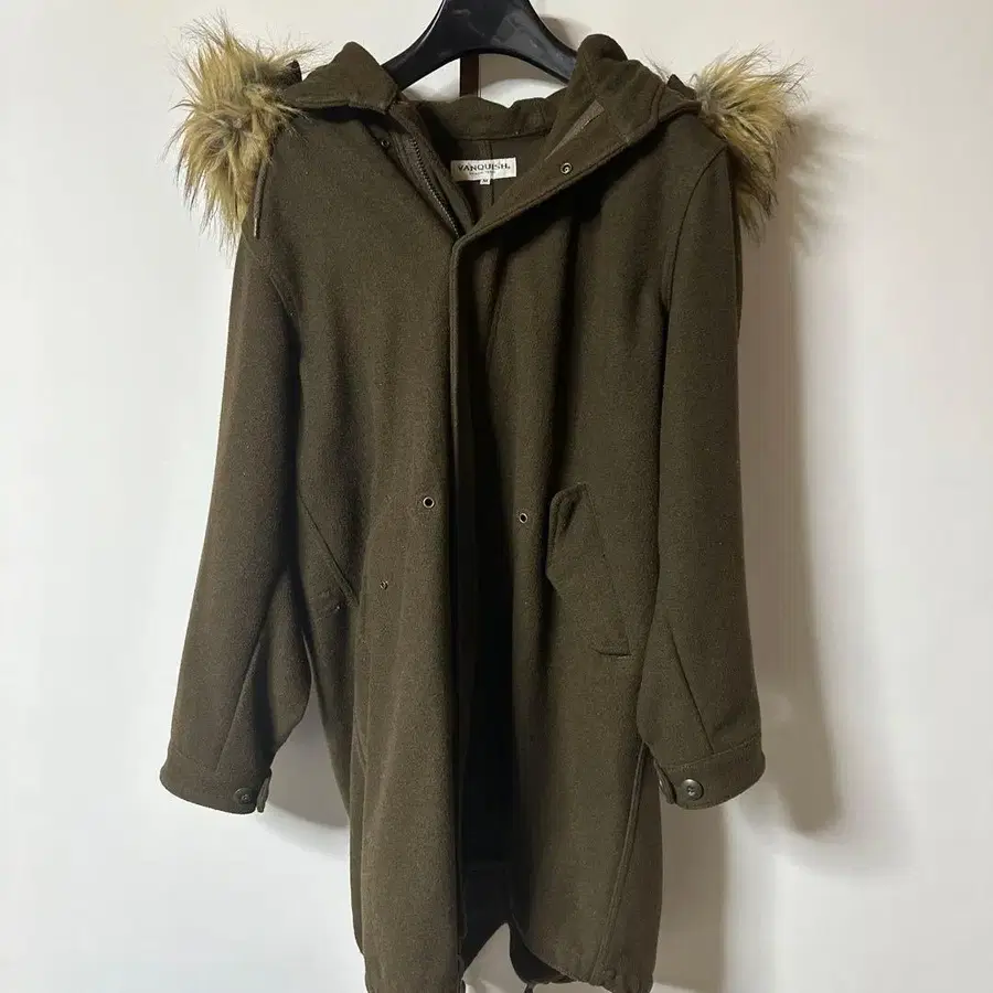 퍼가 달린 후드의 올리브색 모즈 코트, 사이즈 M.