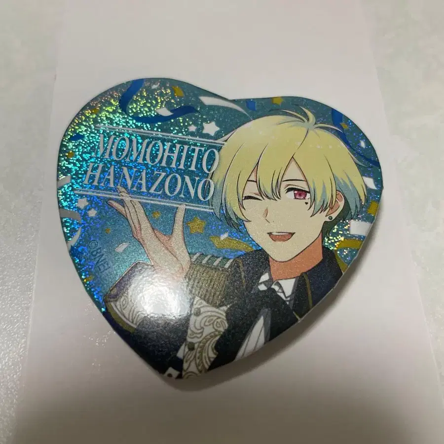 하나조노 모모히토의 홀로그램 가공 하트형 핀 배지.