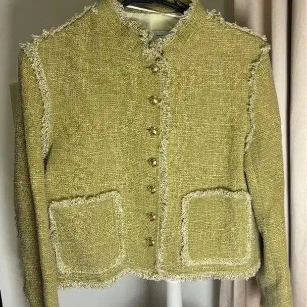 ZARA의 라이트 그린 트위드 자켓입니다. 캐주얼에도 포멀에도 최적입니다.