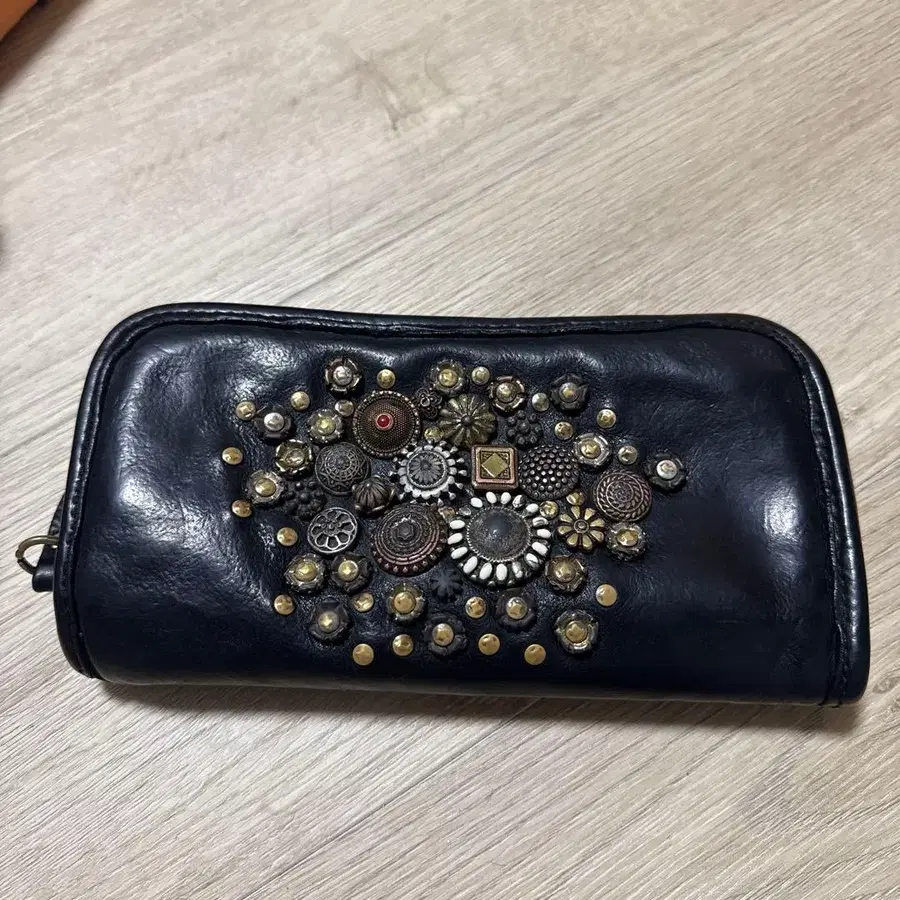 장식적인 디자인의 블랙 가죽 장지갑. - 색상: 블랙 - 디자인: 장식 포함 - 브랜드: CAMOMILLA - 소재: 가죽 - 지퍼: 골드 지퍼 방문해 주셔서 감사합니다.