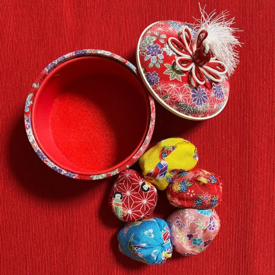 꽃무늬 패브릭 소재의 원형 상자와 작은 공깃돌 세트. - 소재: 패브릭 소재 - 색상: 빨간색, 파랑, 노랑, 핑크 - 내용물: 작은 패브릭 소재 공깃돌 - 디자인: 꽃무늬 - 모양: 원형 상자 - 장식: 술 장식 포함 방문해 주셔서 감사합니다.