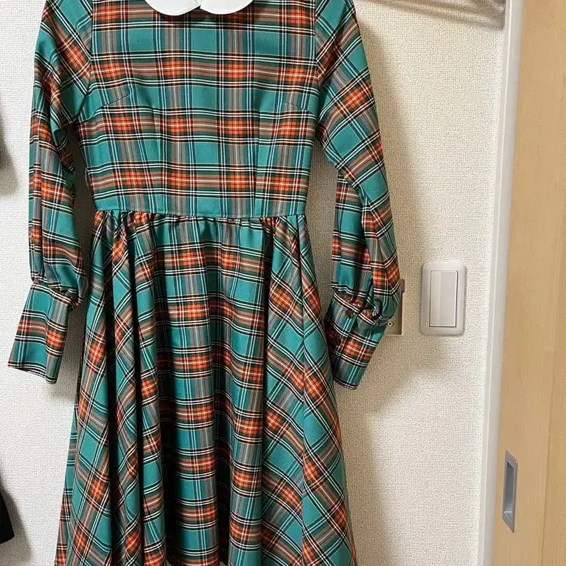터콰이즈와 오렌지 체크 무늬, 화이트 옷깃이 특징인 긴팔 원피스.