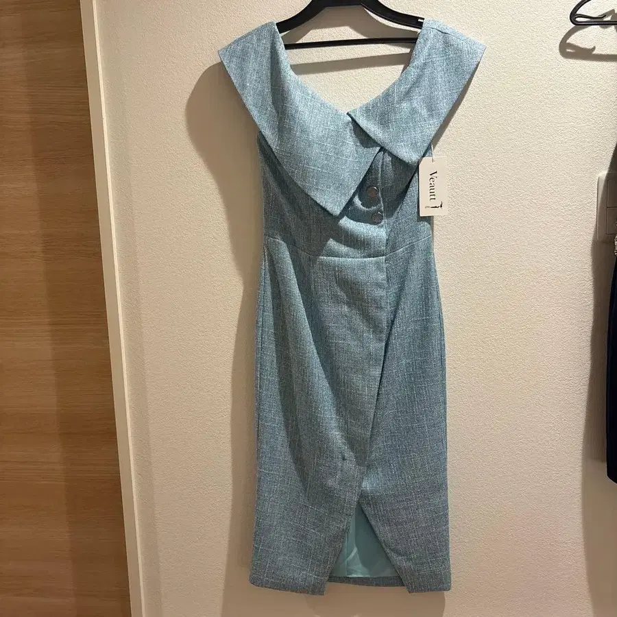 스카이블루 색상의 오프숄더 타이트 드레스, 버튼과 슬릿 디자인. - 브랜드: Veaut - 색상: 스카이블루 - 디자인: 오프숄더, 버튼 포함, 슬릿 포함 - 스타일: 타이트 드레스 - 소재: 텍스처 마감 방문해 주셔서 감사합니다.