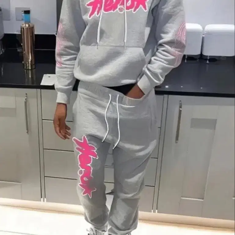 핑크색 로고가 특징인 그레이 후드티와 팬츠 세트. - 색상: 그레이 - 디자인: 핑크색 로고 프린트 - 사이즈: M 방문해 주셔서 감사합니다. 사이즈 - M