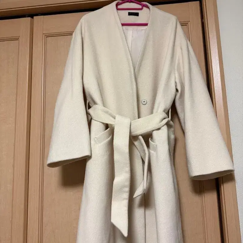 심플한 화이트 롱 코트, 허리 벨트와 포켓이 있어 실용적입니다.