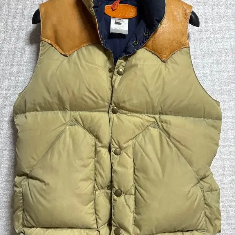 - 디자인: 다운 베스트, 가죽 어깨 패치, 단추식