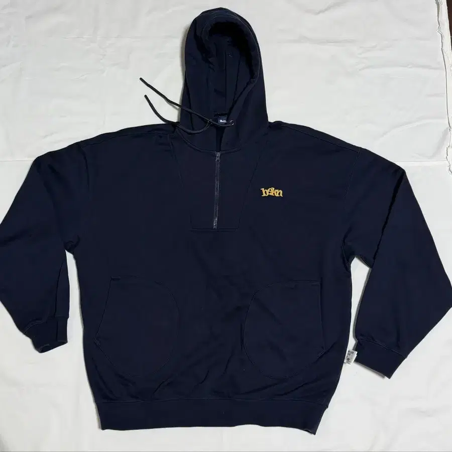 프론트 지퍼와 자수 로고가 특징인 네이비 후드티.