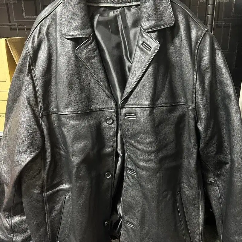 고품질의 블랙 가죽 캐주얼 자켓, 단추식과 포켓 부착으로 실용적입니다.