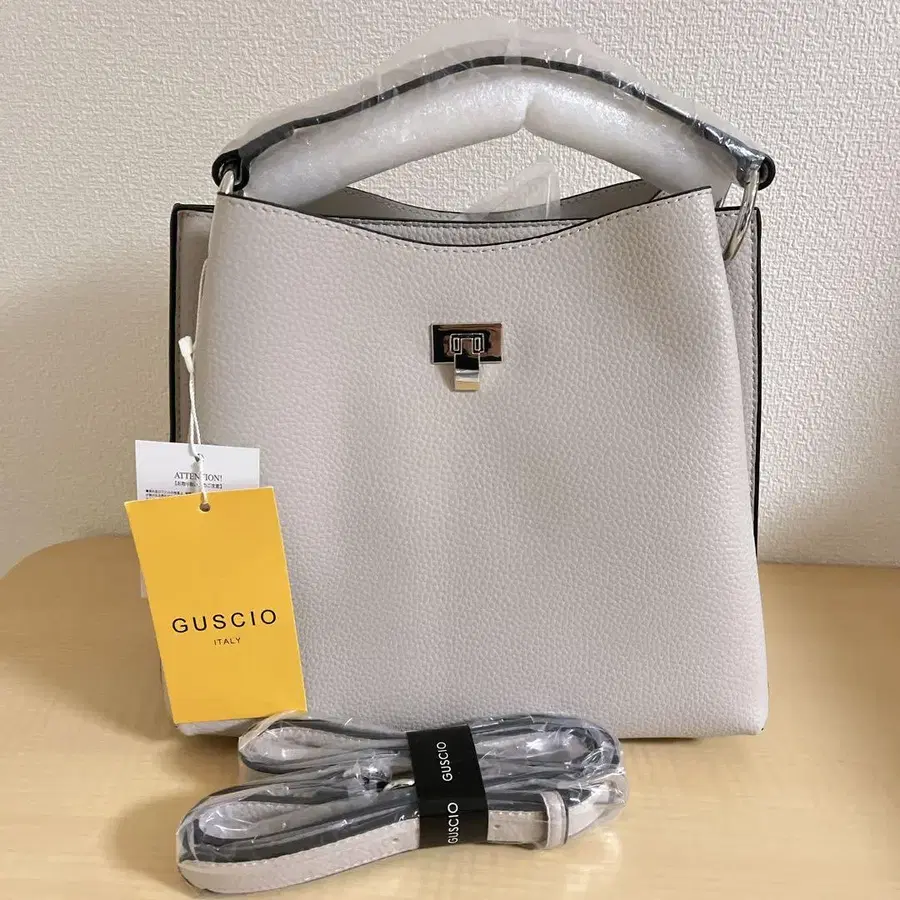 GUSCIO 원 핸들 스퀘어 핸드백 그레이지입니다. 택 포함입니다. 부속품으로 숄더 스트랩이 있습니다. 핸드백 또는 숄더백으로 사용할 수 있습니다. W25(17)cm H22cm D10cm