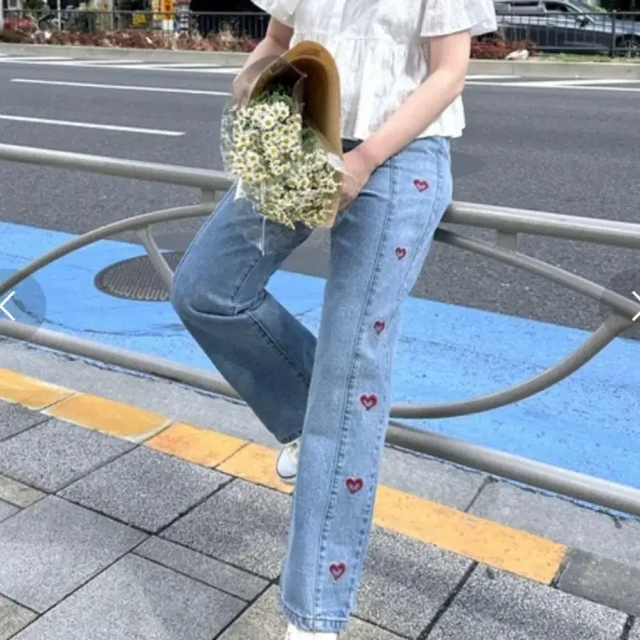 자동 번역되었어요. 원문보기하트 자수가 들어간 코튼 100% 데님 팬츠, 프리 사이즈.
