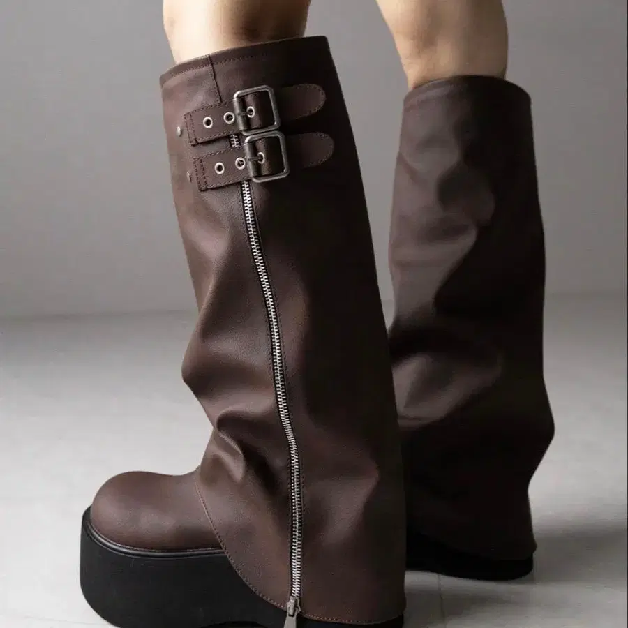 다크 브라운 가죽 롱 부츠 지퍼 포함