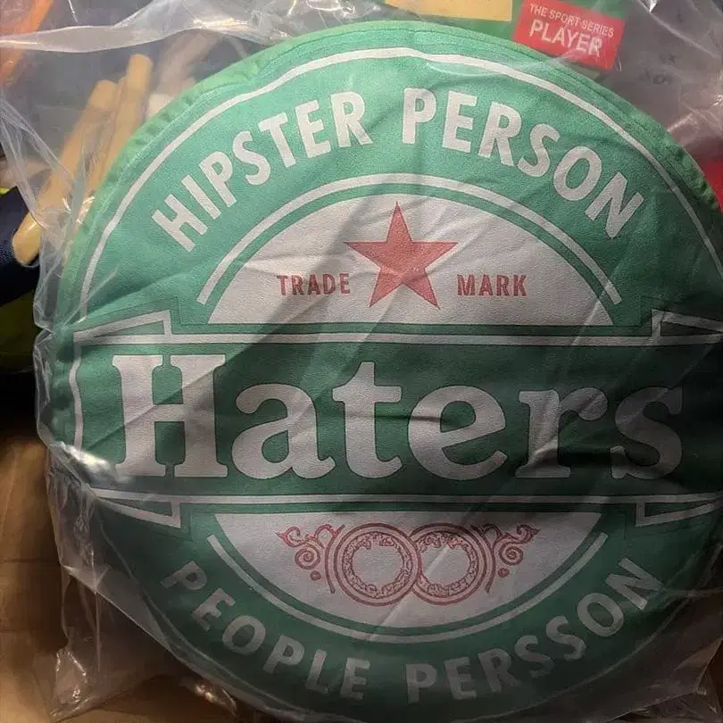 유니크한 디자인의 그린 컬러 원형 쿠션, 미사용. - 디자인: 그린 컬러의 원형 쿠션, 중앙에 [ Haters ]라고 크게 인쇄되어 있음 - 특징: [ HIPSTER PERSON ] 및 [ PEOPLE PERSON ] 텍스트가 주변에 디자인되어 있음 - 상태: 미사용 상태로, 봉투에 들어 있음 방문해 주셔서 감사합니다.