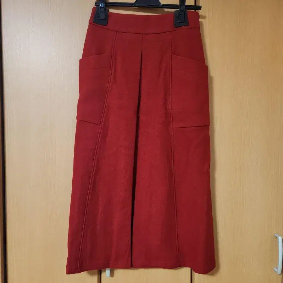앞면에 포켓이 달린 빨간색 롱 스커트입니다. 뒤쪽에 지퍼가 있습니다.