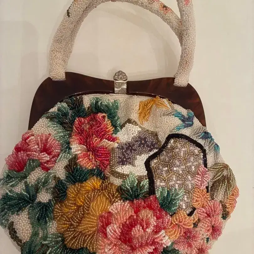 화려한 꽃무늬 비즈 자수의 일본 의류용 백. 가로 길이 약 20cm 세로 손잡이 아래부터 약 17cm