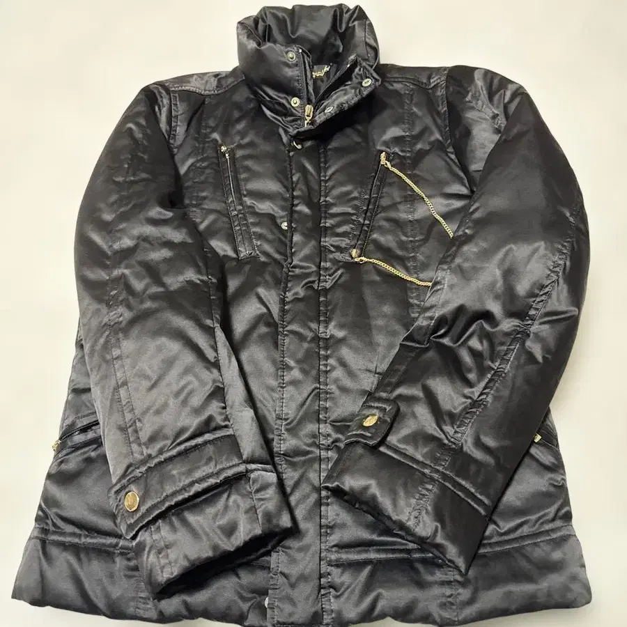 골드 컬러 장식이 특징인 블랙 다운 자켓, M 사이즈.