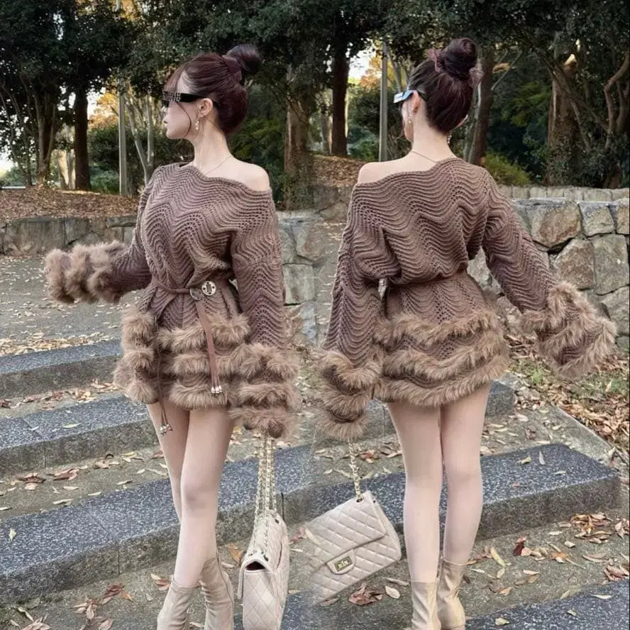 elmyu 퍼 니트 원피스 벨트 set
