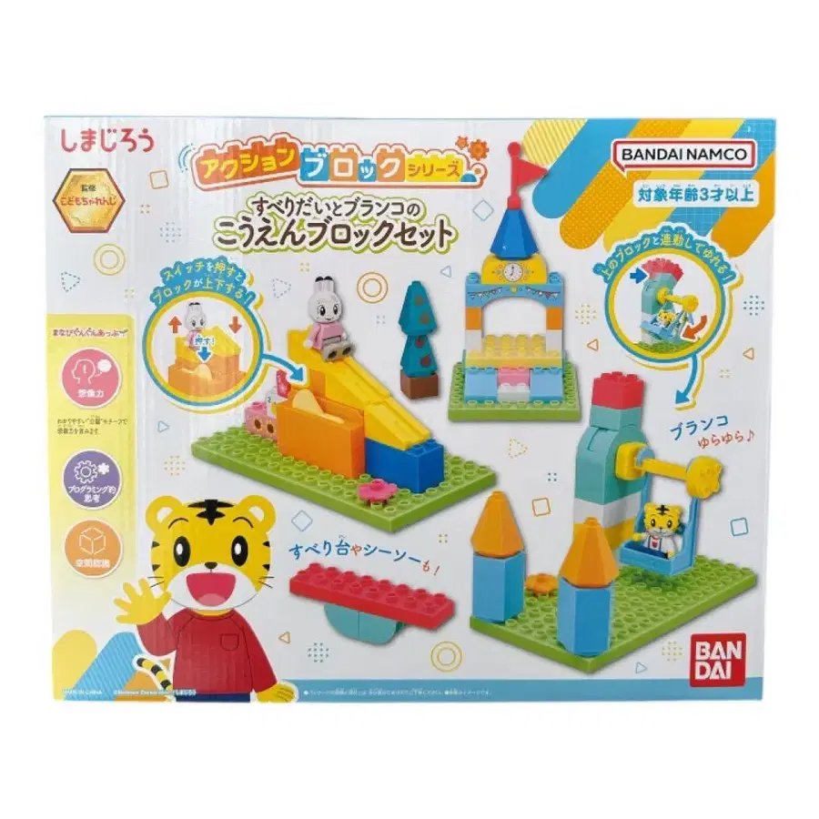 다양한 놀이 방법이 가능한 컬러풀한 블록 세트로, 창의력을 키우는 완구입니다. 정가 7200엔 - 브랜드: BANDAI - 상품명: 공원 블록 세트 - 색상: 컬러풀 - 특징: 놀이 방법이 다양하고 창의력을 키움 - 대상 연령: 3세 이상 - 세트 내용: 블록, 캐릭터 인형 2개 포함 - 미끄럼틀, 그네, 시소 등 여러 가지를 만들 수 있습니다. - 아이 챌린지 감수 방문해 주셔서 감사합니다.