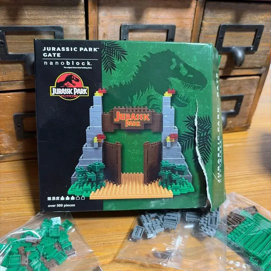 Jurassic Park의 게이트를 재현한 nanoblock 키트, 500개 이상의 피스로 조립 가능.
