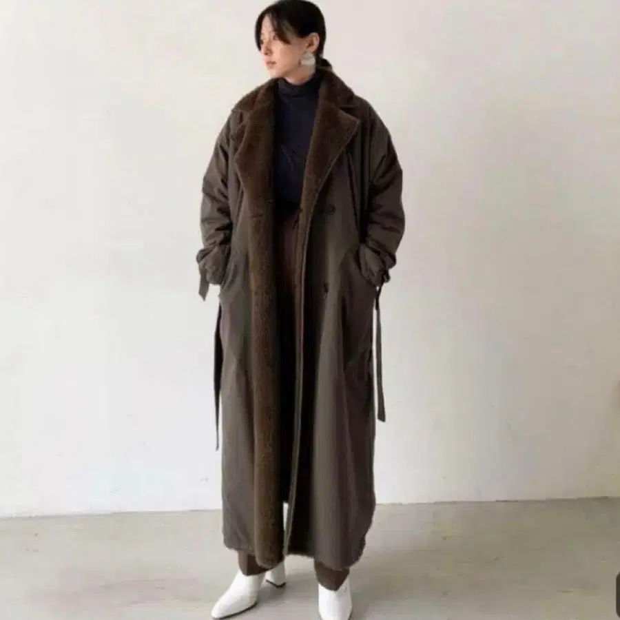 겉면은 심플하고 고급스러운 더블 코트, 안쪽은 몸통은 보아, 소매는 퀼팅 디자인으로 포인트를 준 코트이므로