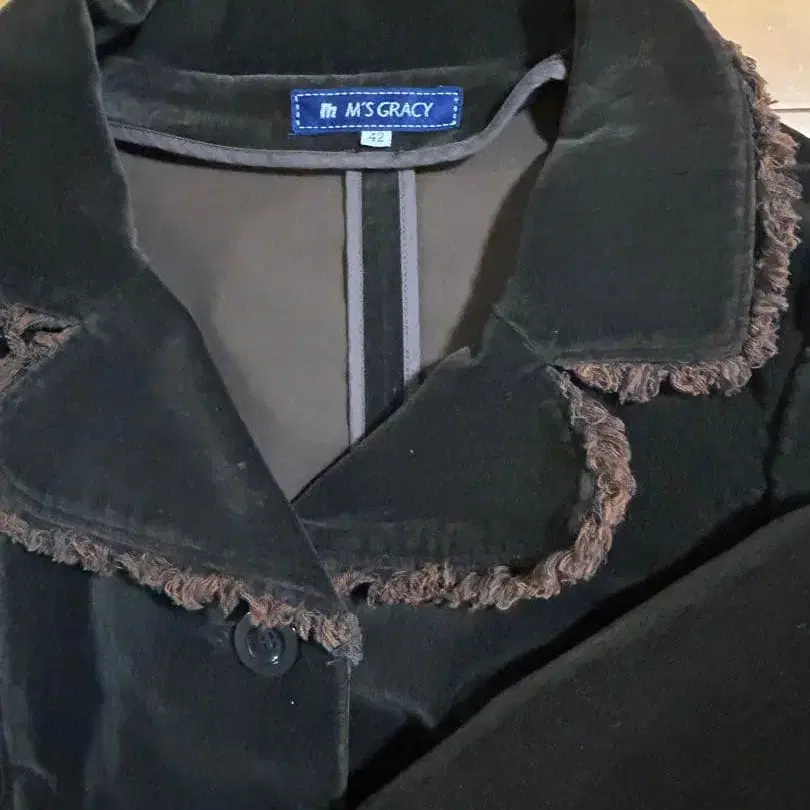자동 번역되었어요. 원문보기프린지가 달린 옷깃이 특징인 다크 브라운 테일러드 자켓, 사이즈 42, 폴리에스테르 소재.