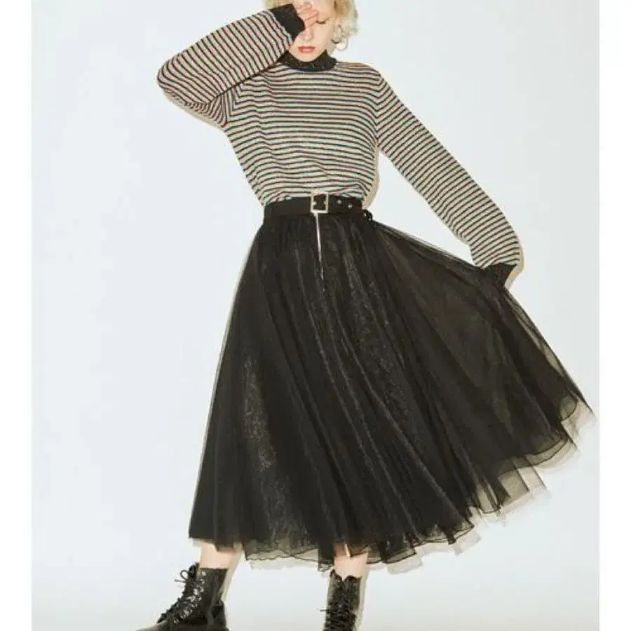 튤 소재 플레어 롱 스커트, 블랙. 여러 겹의 원단이 겹쳐져 풍성한 실루엣을 연출합니다. - 색상: 블랙 - 소재: 튤 - 스타일: 롱 스커트 - 벨트: 있음 - 디자인: 플레어 사이즈 - M