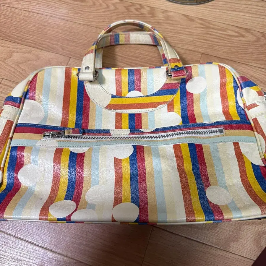 멀티 컬러 스트라이프 디자인, 외부 포켓이 달린 핸드백입니다. - 브랜드: Jacques Le Corre 리스본 - 색상: 멀티 컬러 - 디자인: 스트라이프와 도트 - 안쪽 소재: 나일론 - 지퍼: 외부 포켓 부착 방문해 주셔서 감사합니다. 크기는 마지막 이미지를 참고해 주세요. 사용했기 때문에 색감이 옅어졌습니다.