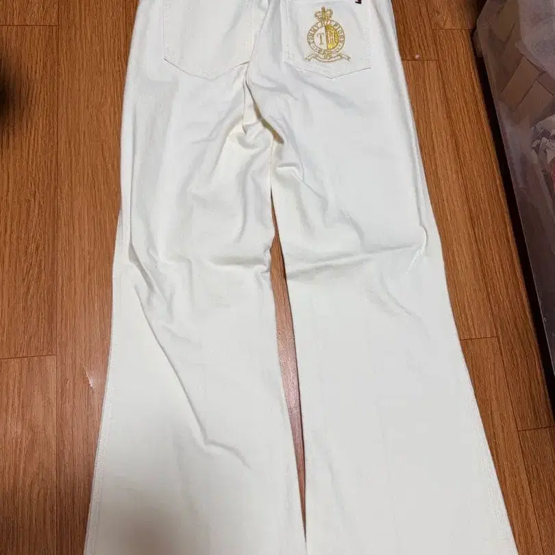 화이트 플레어 팬츠, TOMMY HILFIGER 자수 로고 포함.