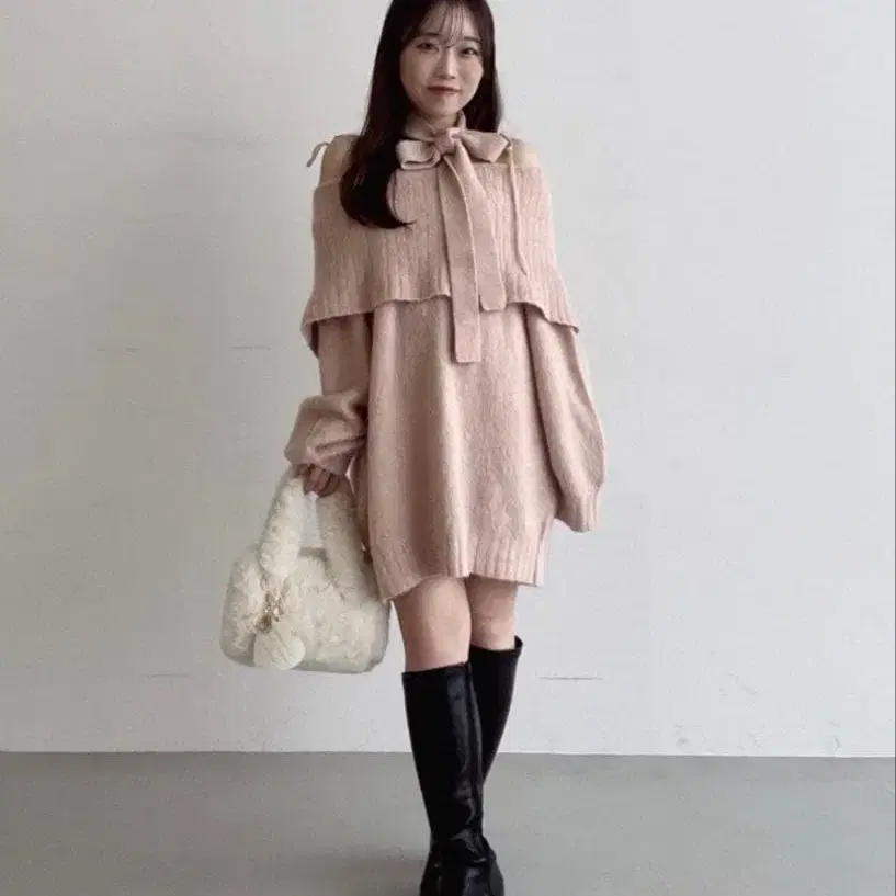 오프숄더 리본 니트 원피스