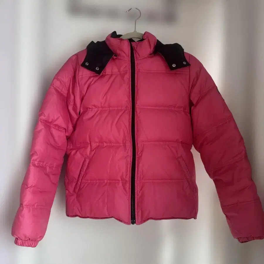 후드와 퍼가 달린 핑크 다운 자켓으로, 팔에 브랜드 로고 자수 패치가 달려 있습니다.