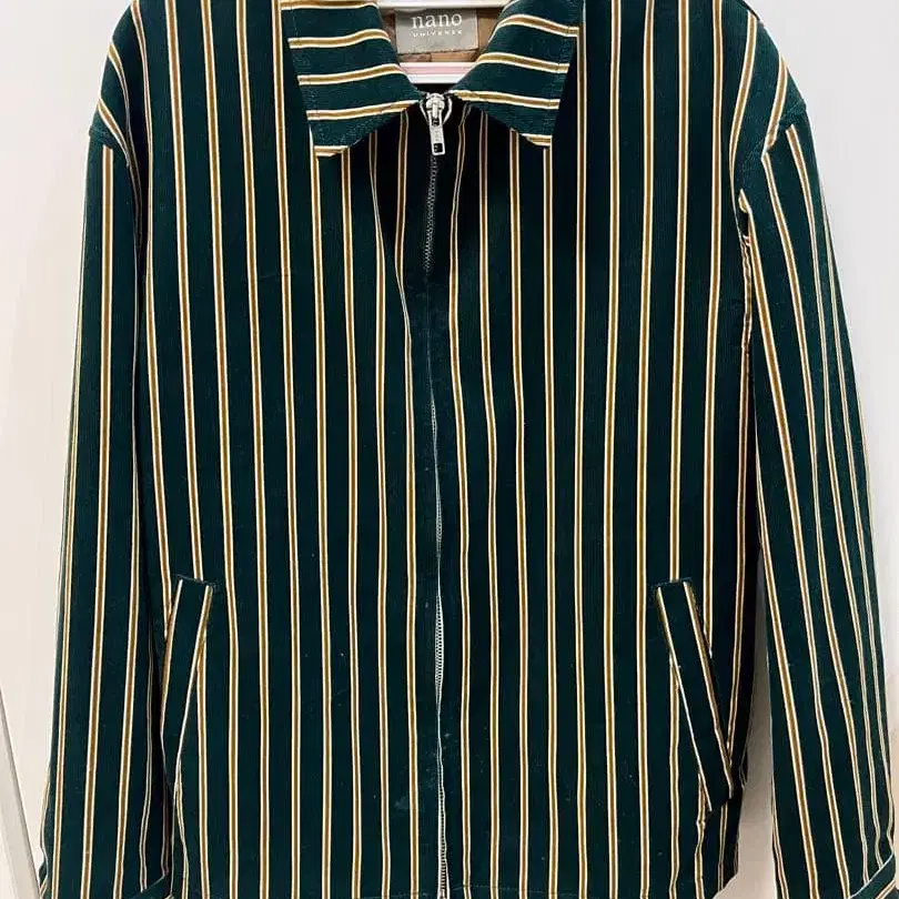 자동 번역되었어요. 원문보기다크 그린과 크림 스트라이프 코듀로이 자켓, 지퍼가 있어 캐주얼한 스타일에 최적.