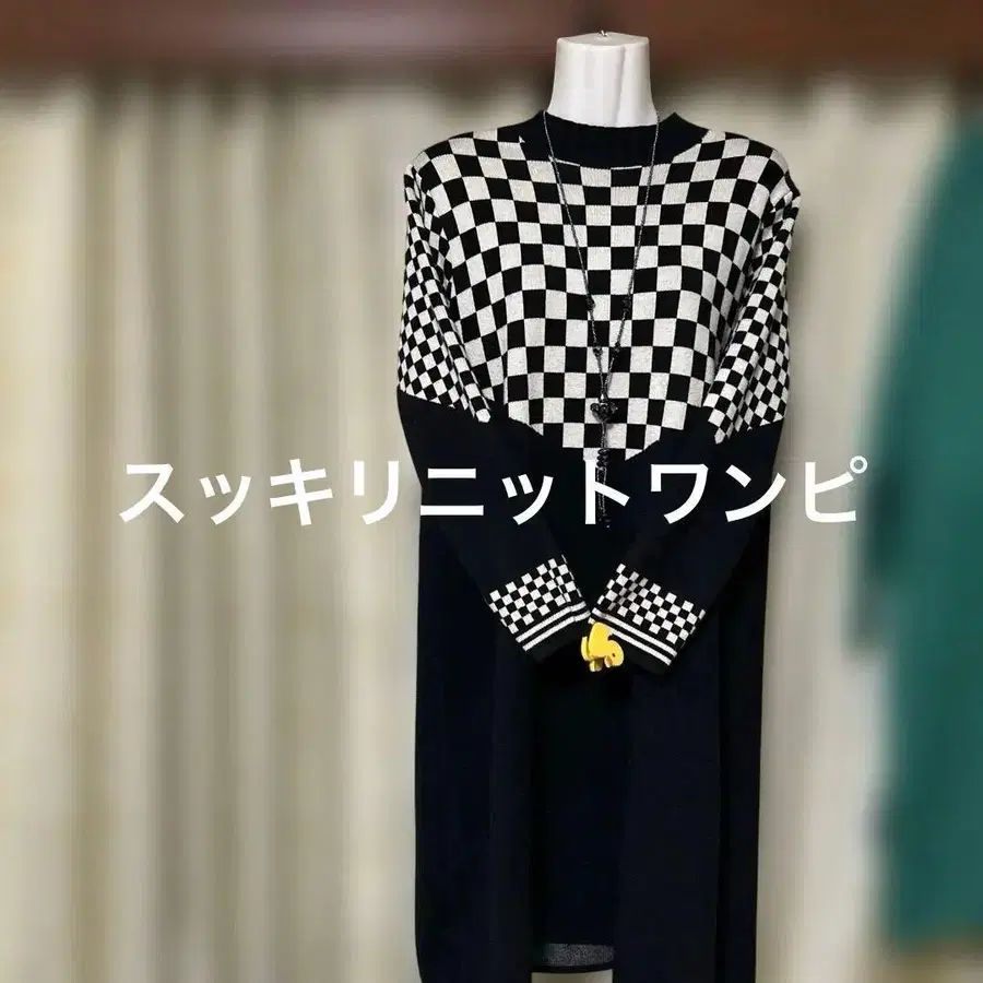 체크 무늬 니트 원피스로, 넉넉한 실루엣이 매력적입니다.