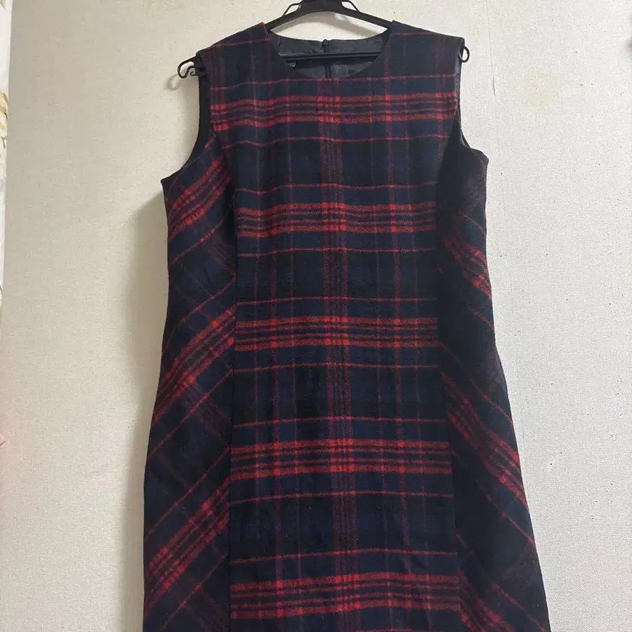 로라 애슐리 슬리브리스 무릎 기장 원피스 네이비 x 레드 체크 무늬