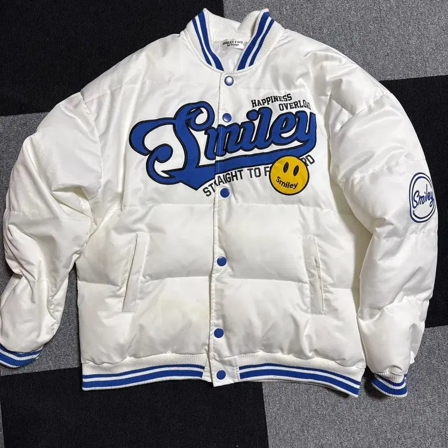 화이트 나일론 소재의 바시티 자켓, Smiley 로고 포함. - 브랜드: Smiley - 색상: 화이트 - 디자인: 로고 프린트 - 스타일: 바시티 자켓 - 소재: 나일론 방문해 주셔서 감사합니다.