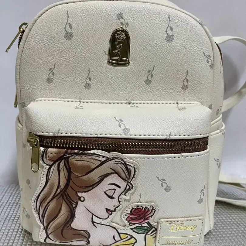 - 디자인: 화이트 컬러의 합성 피혁에 장미를 든 벨 캐릭터 자수