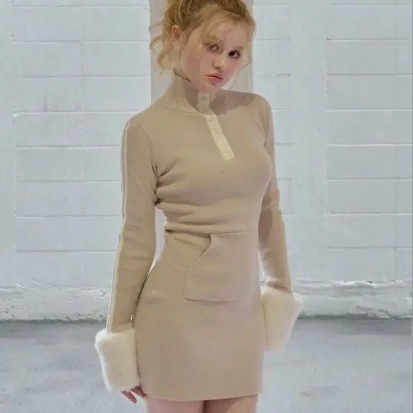 andmary 조에 퍼 미니 드레스 베이지 니트