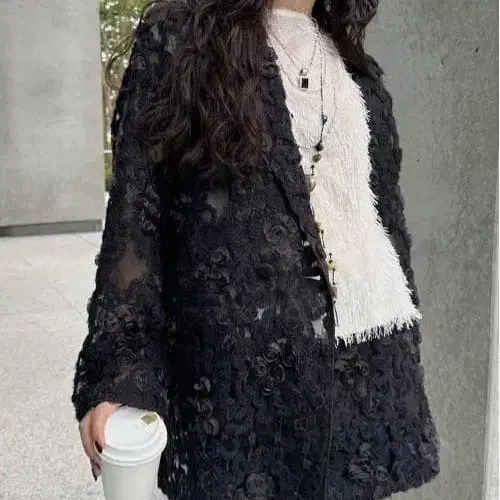 Ameri FLOWER MIX LACE SHEER JACKET 블랙 오리지널 레이스 원단을 사용한 시어 자켓. 튤 원단을 베이스로, 시어 테이프와 기모 모헤어 실을 사용하여 입체적으로 제작. 더욱이 꽃 모티브를 결합하여, AMERI다운 성숙한 레이디 스타일의 아이템으로 완성했습니다. 안감에는 오간자 소재를 사용하여, 내추럴한 인상을 줍니다. 신체 라인을 드러내지 않는 넉넉한 실루엣으로, 골격이나 나이에 상관없이 폭넓은 분들이 착용하실 수 있습니다. 동일한 소재의 스커트와 함께 코디네이트하는 것도 추천합니다. 코디 방법에 따라 롱 시즌 돌려입기 가능하므로, 하나 가지고 있으면 유용합니다. 이곳에서 구매한 것이지만, 당시부터 브랜드 택이 없었습니다. 다른 색상을 보유하고 있지만 디자인은 동일합니다. 신경 쓰이지 않는 분께