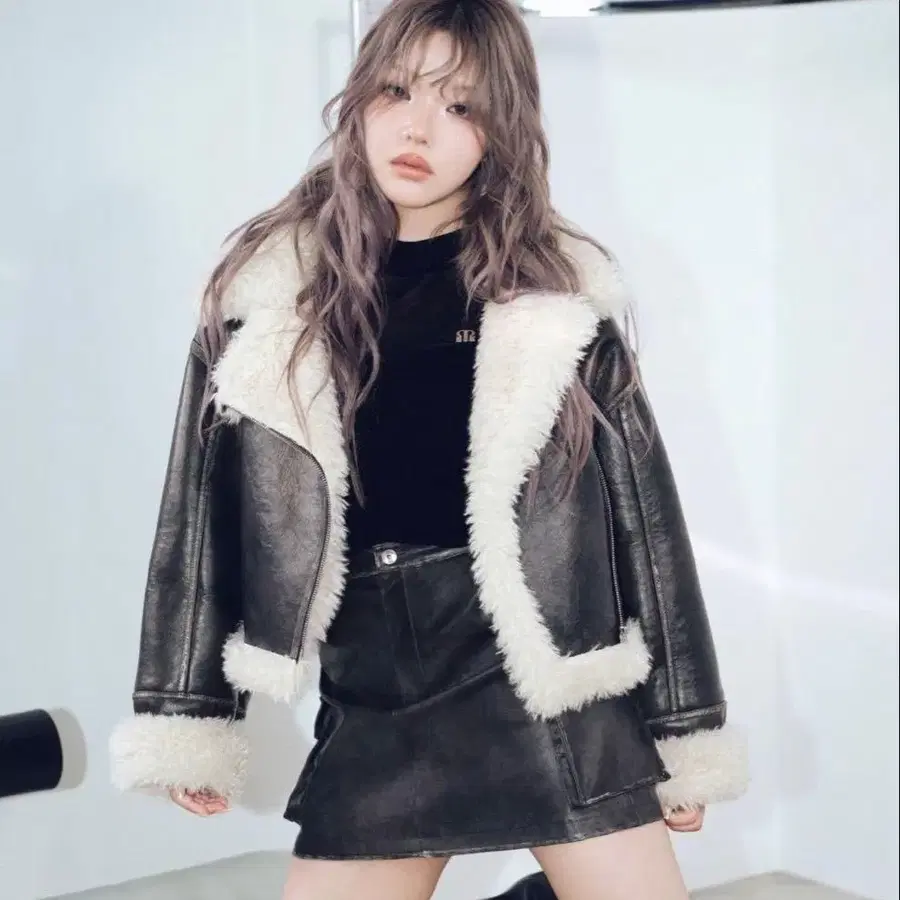 가죽과 인조 모피의 콤비네이션으로, 캐주얼한 숏 기장 자켓
