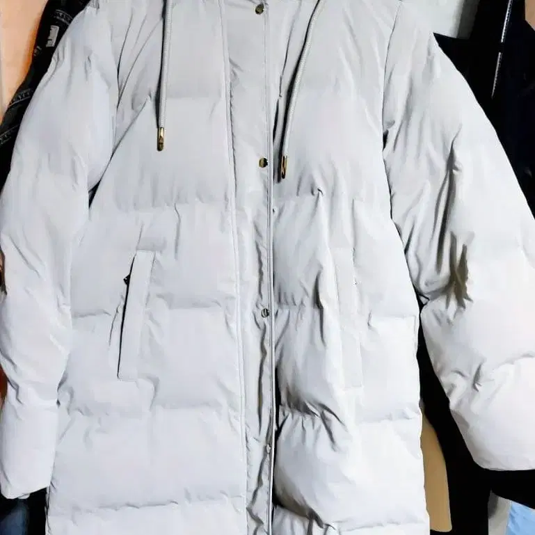 후드 부착 화이트 다운 자켓, 앞면에 2개의 포켓 부착.