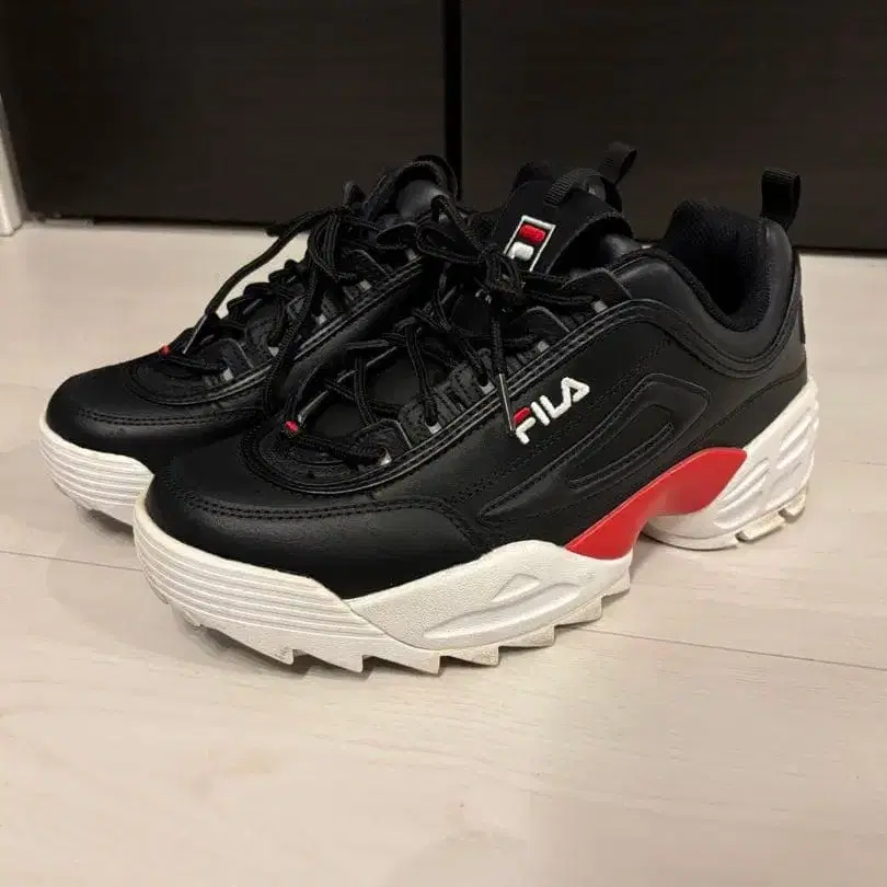 3~4회 정도 신었습니다. 밑창 높이는 사진을 참조해 주세요! FILA의 레트로 스타일 스니커즈, 블랙과 레드의 배색이 특징입니다. - 브랜드: FILA - 색상: 블랙/레드 - 스타일: 스니커즈 - 밑창: 통굽 - 디자인: 레트로풍